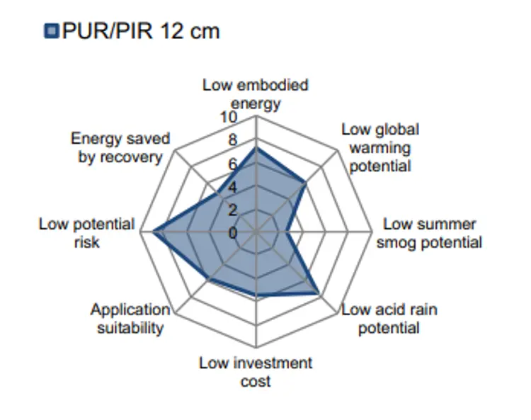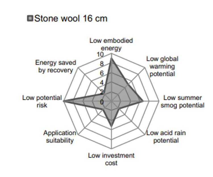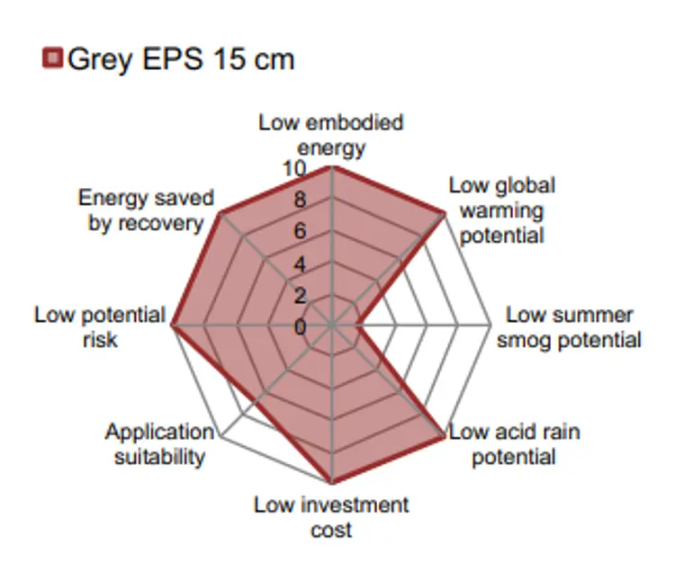 The spider diagrams below are an extract from a recent multi-criteria comparison of insulation materials carried out for EUMEPS. These are taken from the External Wall Insulation comparison and shows EPS having the lowest overall environmental impact.